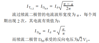 加了續(xù)流二極管后其輸出電壓波形V3與不加續(xù)流二極管時相同。原先流經橋臂上元件的續(xù)流電流變成通過二極管續(xù)流。各原件中流過的電流波形和變壓器副邊電流波形明顯有一定的間隔。每個周期中流過晶閘管T1、T2、D8、D9的電流波形寬度都是π—α,其電流有效值為(Id為負載電流)