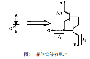 晶閘管的結構相當于串級雙晶體管模型P一N一P一N4層結構,因而具有3個PN結,分別引出陽極A,陰極K,門極G。在圖3結構里無論在PNP和NPN晶體管的A一K端點施加正向電壓還是反向電壓,其中的P一N一P一N結構都處于高阻阻斷狀態(tài),只通過很小正向漏電流或很小的反向漏電流,與一般二極管的反向特性相似。一旦門極電流Ic注入G點,就會由于形成強烈的正反饋導致PNP和NPN進入完全飽和狀態(tài),即晶閘管飽和導通。