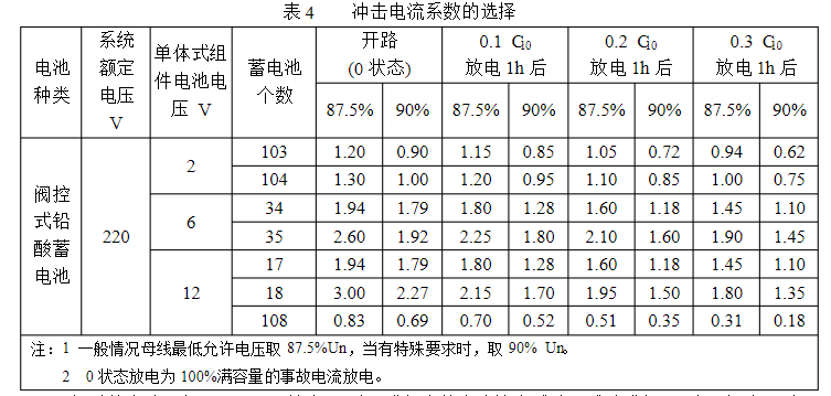 鉛酸蓄電池的事端放電能力試驗(yàn)的沖擊電流應(yīng)根據(jù)蓄電池放電狀況、放電的停止電壓和蓄電池組的個(gè)數(shù)來挑選,其事端放電沖擊電流系數(shù)由表4來確認(rèn)。