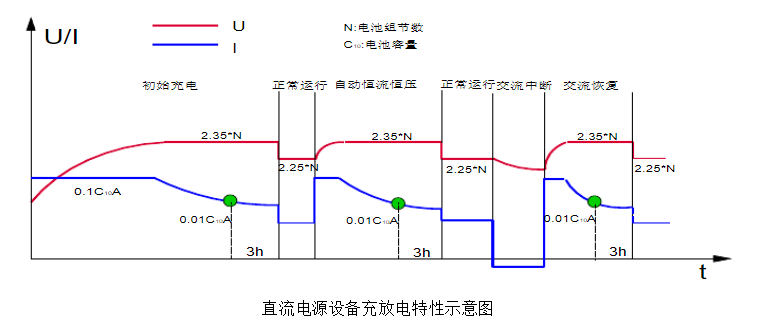 直流電源設(shè)備充放電特性曲線參照下圖所示。