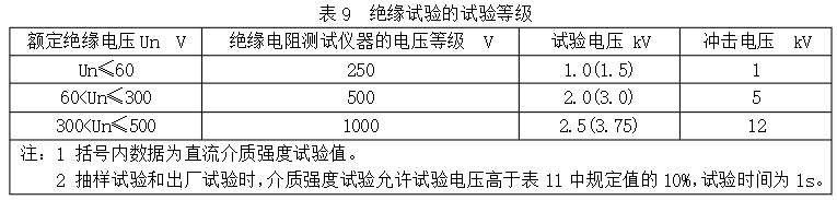 以上所列部位,應(yīng)能承受頻率為50Hz±5Hz之間,表9所列的正弦波實(shí)驗(yàn)電壓值(也可采用直流電壓),歷時(shí)1min的實(shí)驗(yàn),絕緣不該出現(xiàn)擊穿或閃絡(luò)現(xiàn)象。