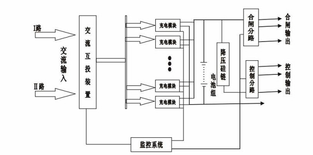常規直流屏由溝通配電模塊、充電模塊、配電監控模塊、降壓硅鏈等零件構成。如圖1為典型的直流屏結構系統。